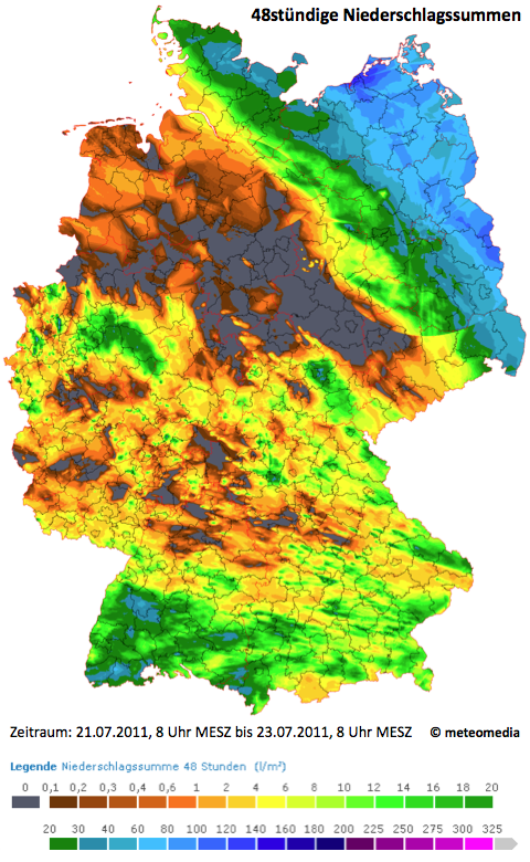 Am 22.07.2011 lag der Regenschwerpunkt nach wie vor über der Nordosthälfte Deutschlands. Verbreitet regnete es von Mecklenburg bis nach Brandenburg länger andauernd und gebietsweise sehr ergiebig. Am 23.07.2011 ließen die Regenfälle im Nordosten endlich nach und zogen zur Ostsee ab.